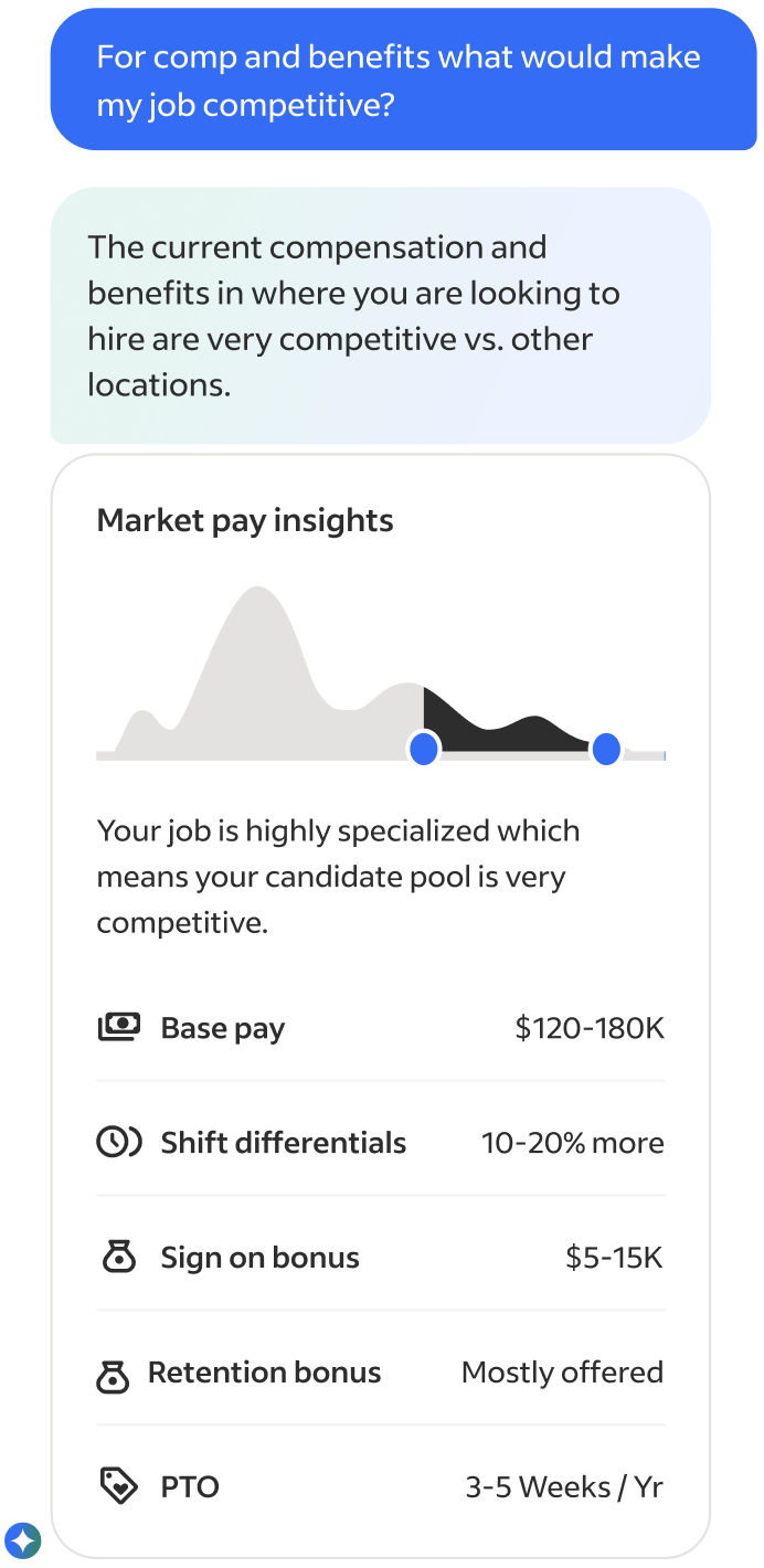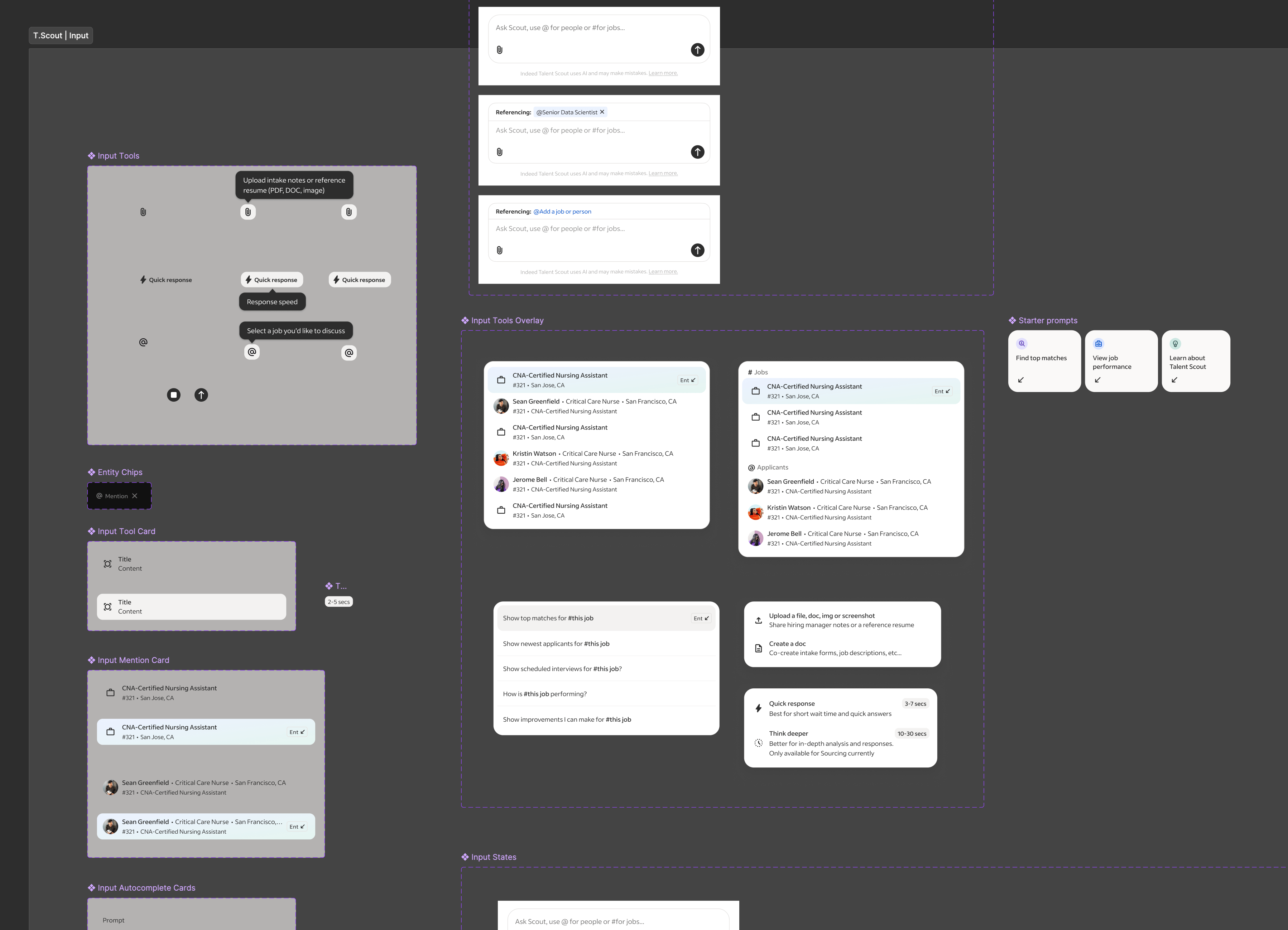 Because our product had to live inside other products and on top of existing Indeed experiences, I collaborated closely with the Design Systems team to ensure consistency while extending beyond existing patterns. We modified the existing foundational elements such as type ramp, icons, and colors to support the constrained space our product existed within. Additionally we built a modular system of cards, charts, and data summaries designed specifically for generated content. This all became the visual foundation for future AI experiences. Lastly partneing with our Marketing and Brand teams we built a sub brand for Talent Scout that fit into our core brand.