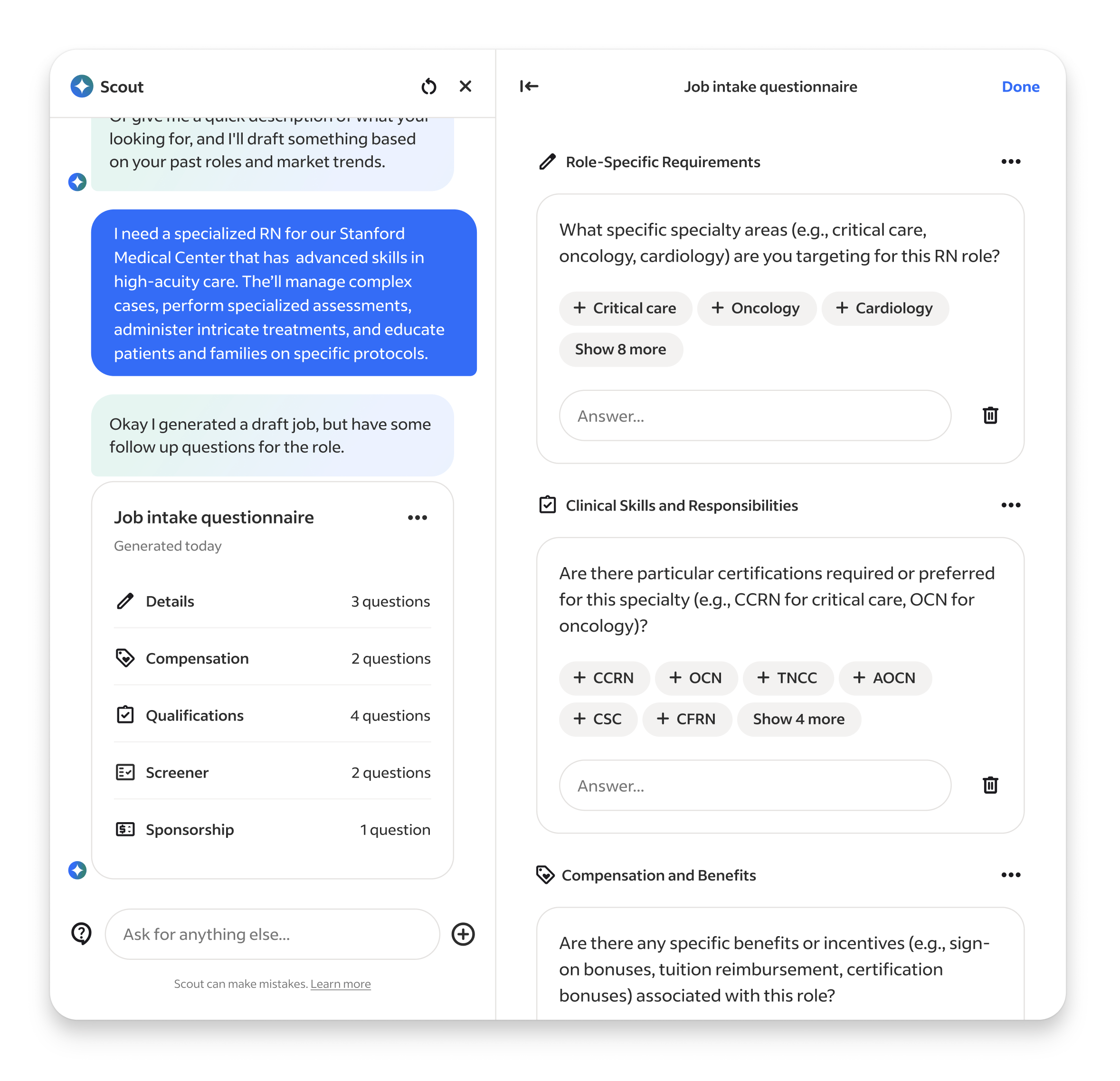 For every major work stream I made the first pass of designing the flow and features, then would hand off the work to the designer leading the work stream. My goal was to set the foundation for making Talent Scout feel like it understood intent and, when appropriate, responded to it by delivering pieces of our core product customized to the users prompt. The user should feel like our Ai scoured our products and data for the information needed, organized and personalized it, and then returned a truly customized artifact just for them, that not only answered their request but also provided actionable next steps. Because of technical and scope limitations my experience POV evolved from the earlier Ai interwoven in a product that rearranged existing interfaces, to one that created its own unique ones and delivered it to the user.