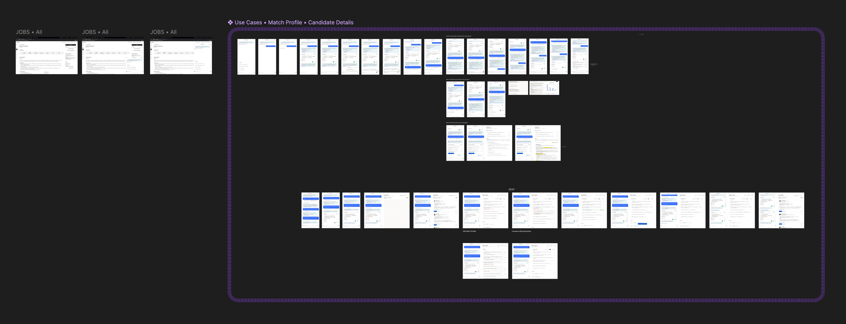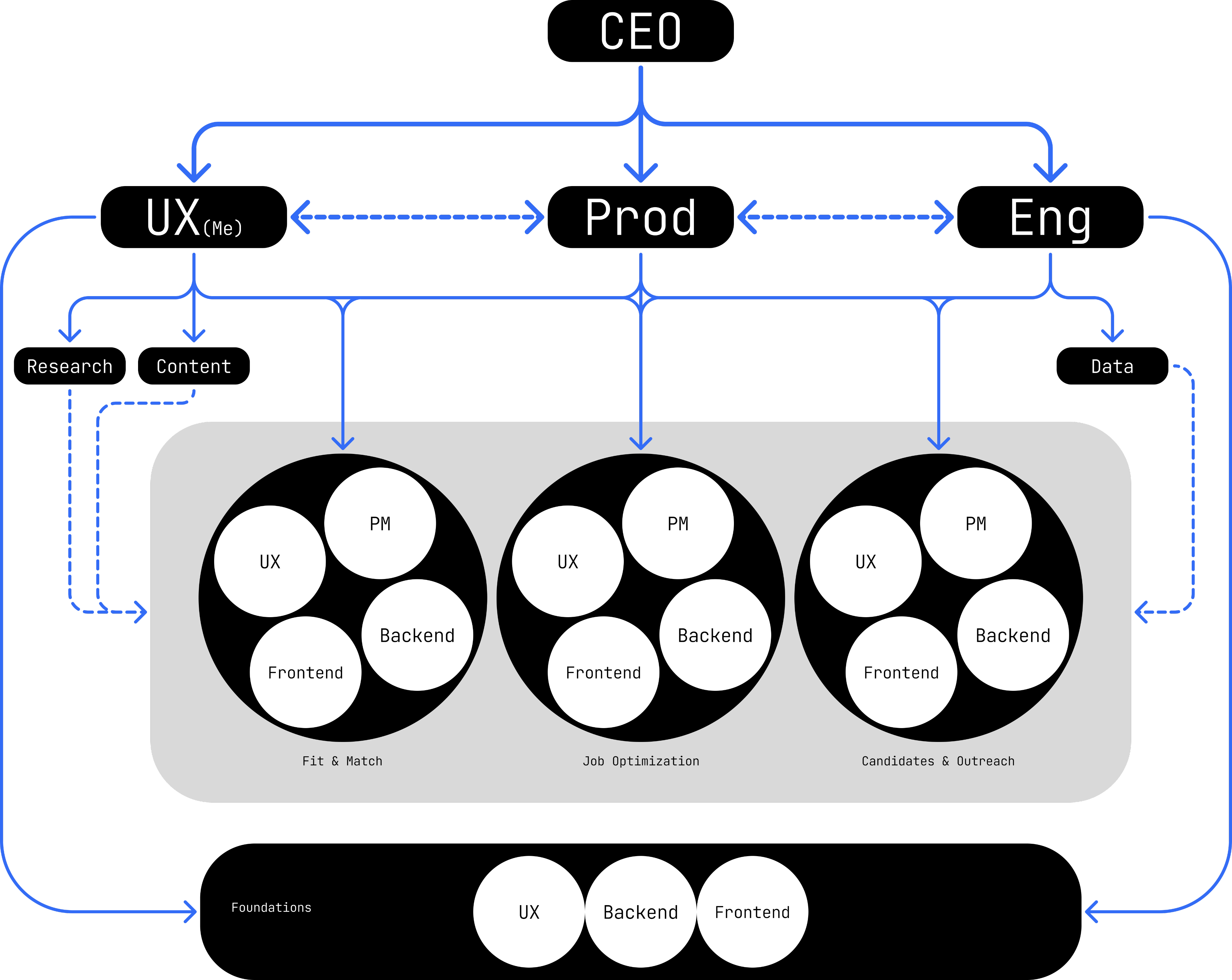 At first I kept the UX team focused as a single unit on the entire product. This helped to onboard and orient everyone to what we were building. Once all our teams got some footing and understanding of what we were building, I mirrored the UX team to our product work streams –Match & Fit, Job Optimization, Candidates and Communications, and Foundations. Each owning a distinct slice of the experience.