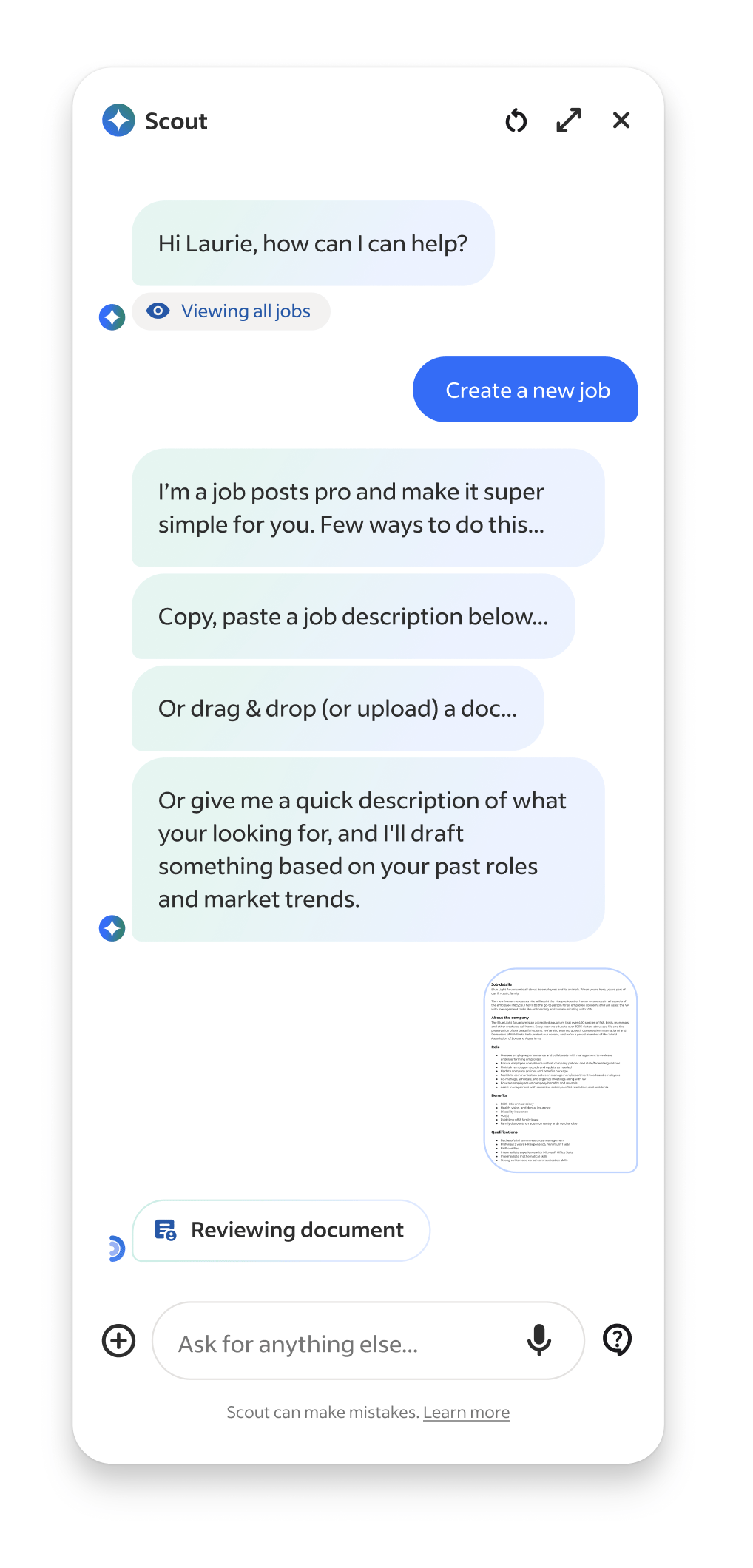 Another limitation was context understanding and since the AI sat on top of other products, it needed awareness of what was on-screen behind it. We iterated on solutions and ultimately built @mention system inspired by social and employer tools that let users reference jobs or applicants to guide the AI’s focus.