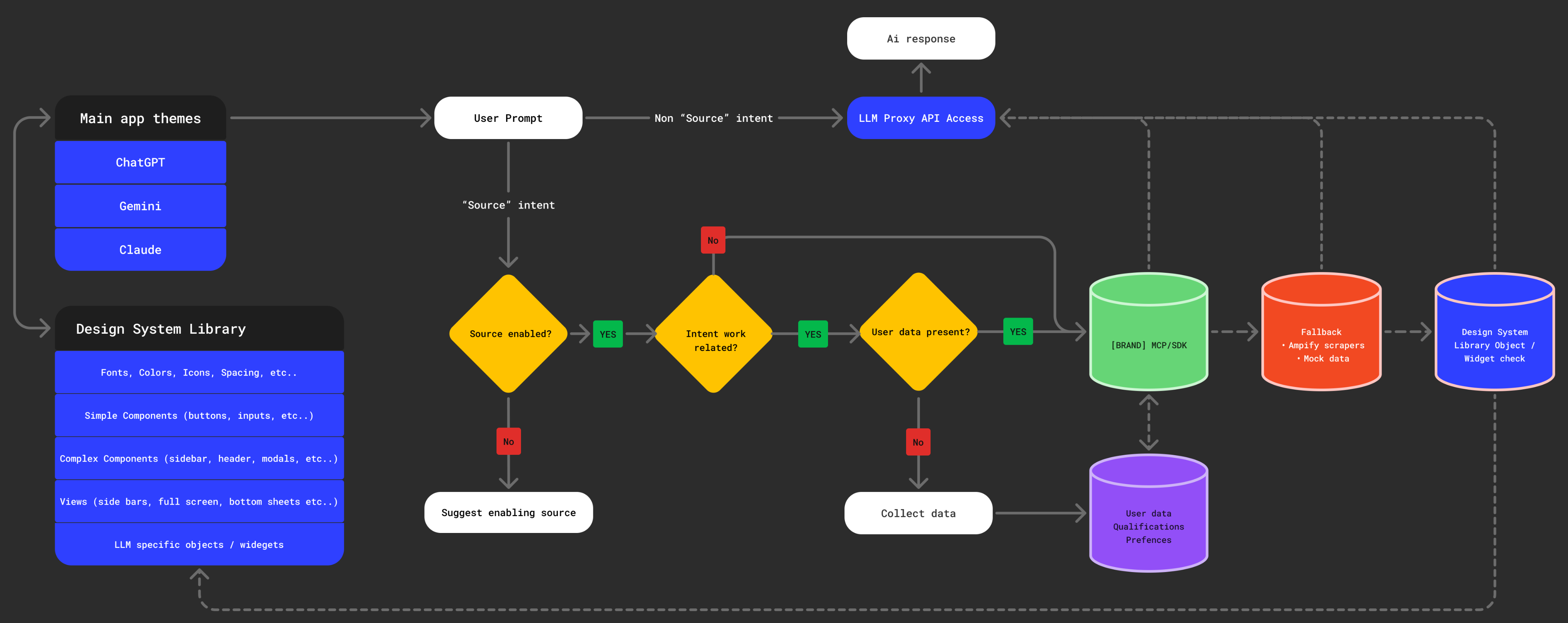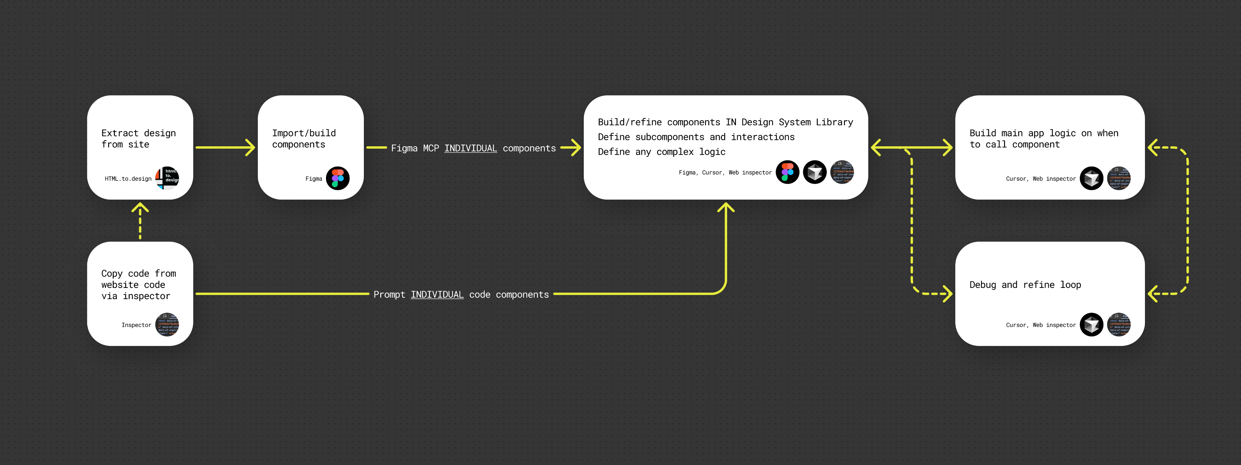 I have yet to “generate” something truly creative, unique, or even just accurate by feeding AI tools prompts / reference imagery alone. When I’ve done this, almost all of the Ai outputs have an “error” of ai-ism. There all kinda structured the same (block and stack, 4 across), use the same styling, and overall just kind feel the same. I create in Figma, refine rapidly, prototype rapidly (have yet to find a valuable and consistent use for Figma Make) then build long lasting protos in Curosr... but that’s information for another time.So far what I found that works best is to still live and breathe Figma design. In order for an AI to understand the design it really needs a link to a design with all of the style properties called out visually and in code. For this project my stack and flow are below. I started with html.to.design to rip the front-end of all the LLMs. [Since I have my design system libraries setup in the prototype I’ve recently been experimenting with coping the code directly from the site via web inspector and dropping that code directly into a prompt... mixed results.]